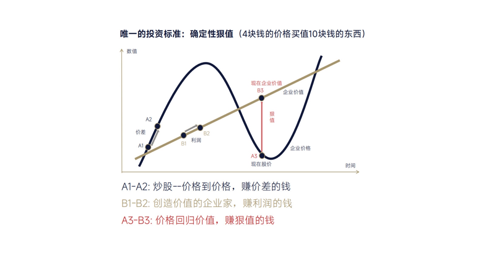 梦工场所赚取的,并非传统意义上的市场价格波动带来的差价,也不是单纯依赖企业利润增长带来的收益,而是基于其独特的“ 狠值 ”逻辑——通过严格的价值判断,以远低于内在价值的价格(以4块钱的价格买值10块钱的东西),等待价格最终回归价值,从而实现确定性极强的回报。